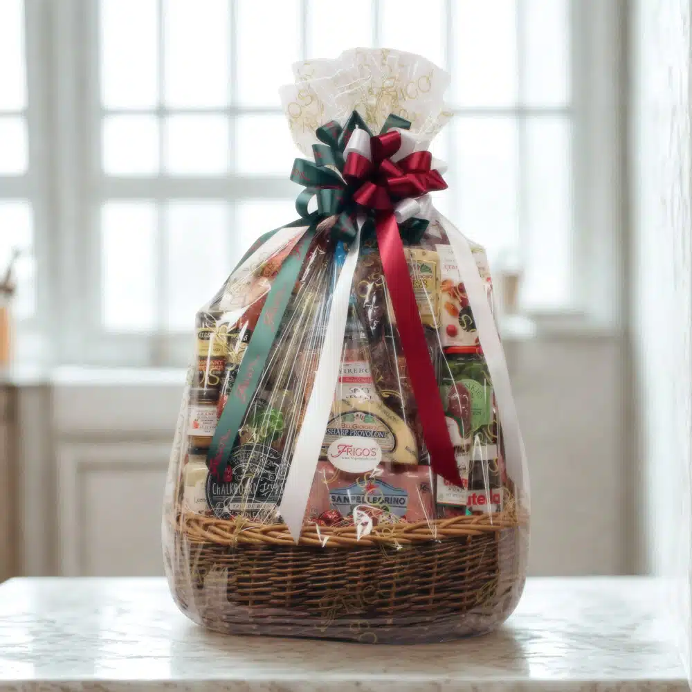 This indulgent basket features a selection of premium Italian meats and cheeses, paired perfectly with savory relishes, briny olives, and our homemade sauce. Satisfy your cravings with delicious pasta and a bottle of exquisite wine, making this gift basket perfect for special occasions. Order now and indulge in the ultimate taste experience of Italy’s finest flavors.